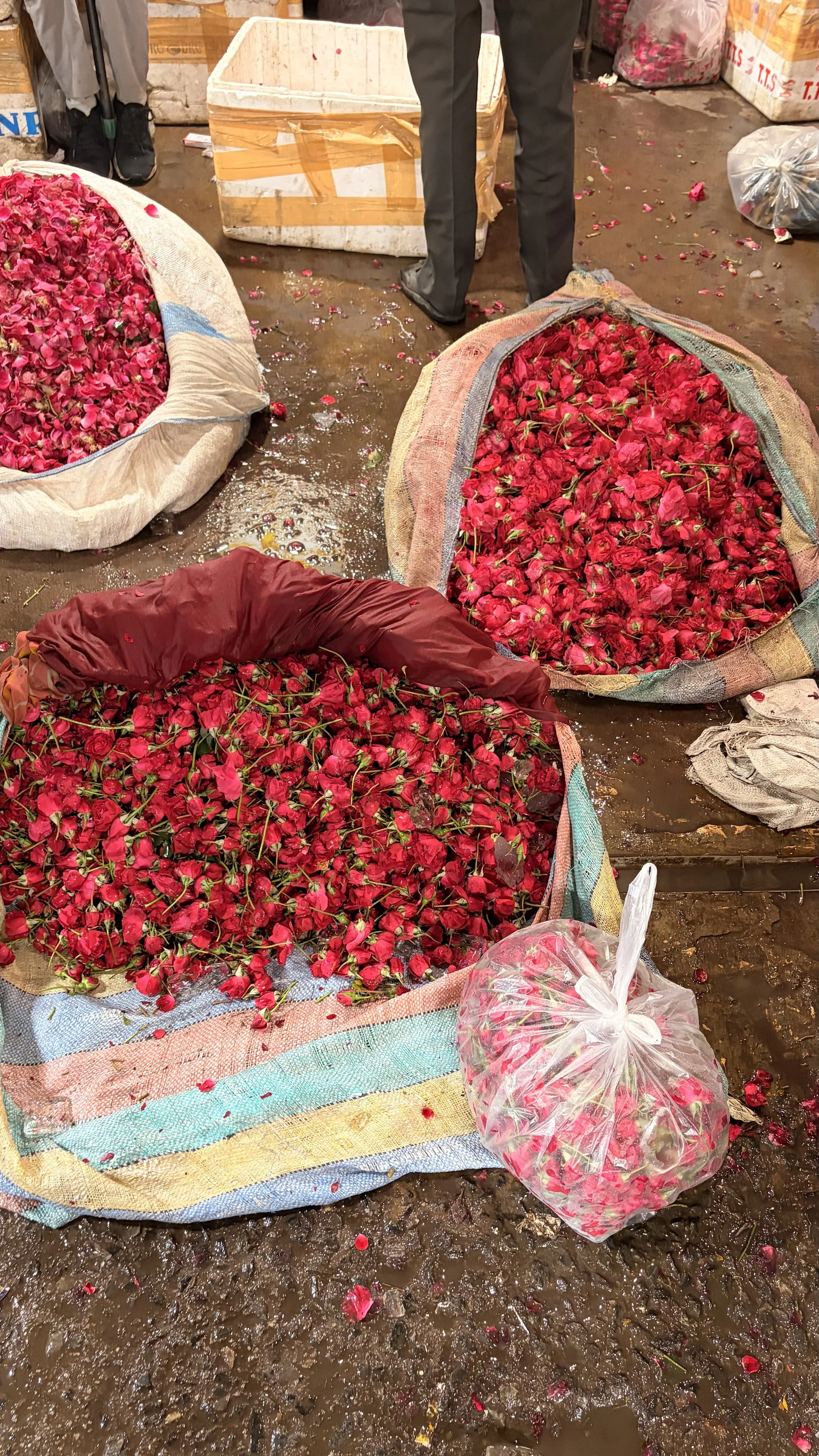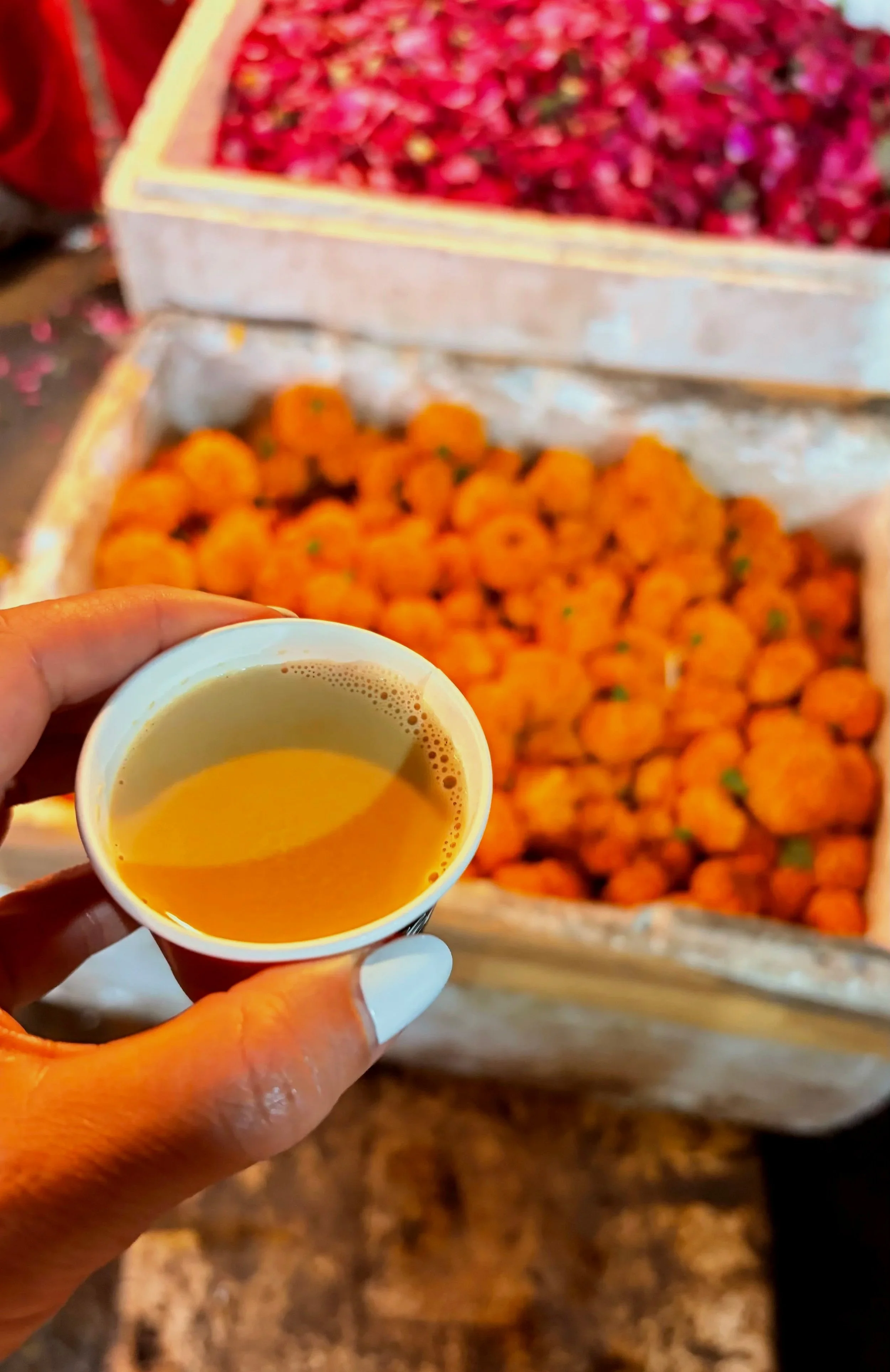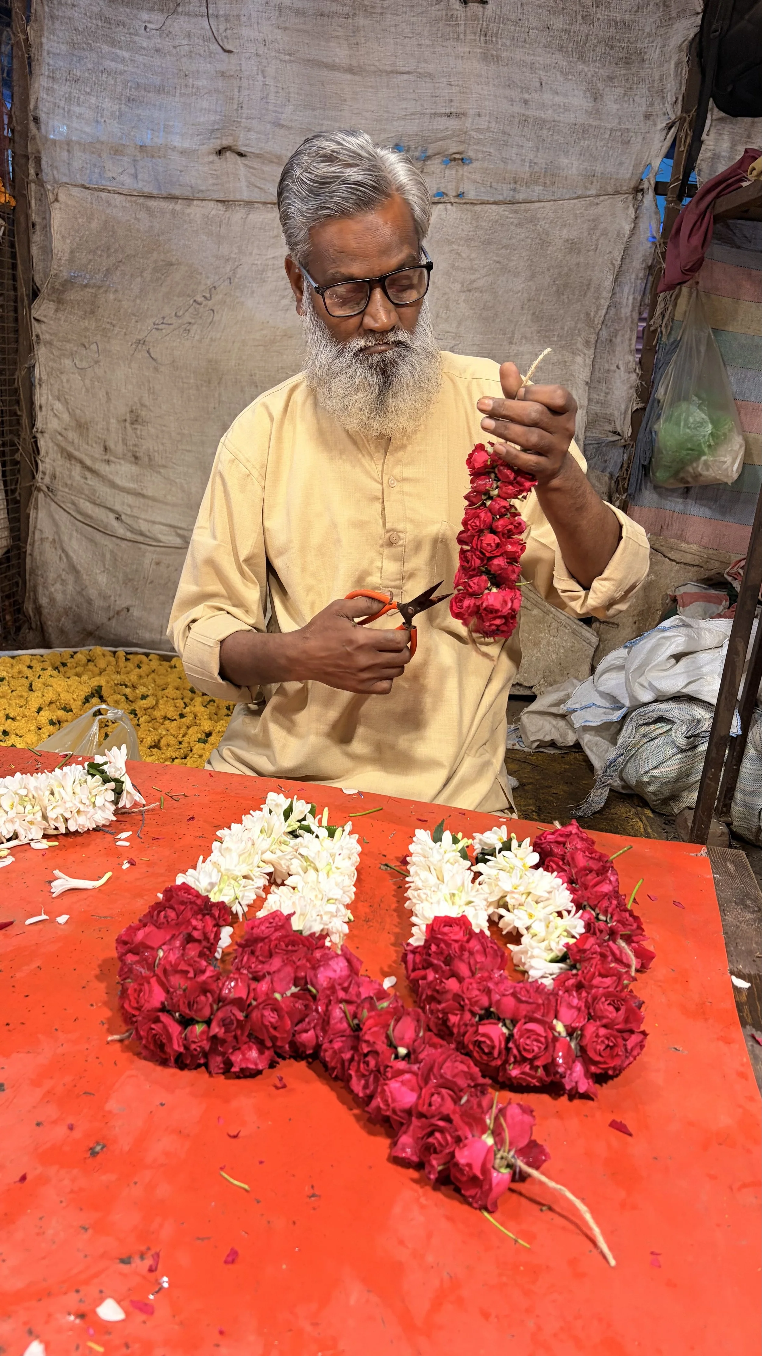Amid this density, small chai stalls appear, preparing tea to individual taste—more sugar, less milk, adjusted in quick exchanges. Close to the temple, garlands for the gods are threaded on the spot, while fresh rose petals are plucked by hand and collected in shallow containers. Ice cubes are scattered over blooms to keep them cool and vibrant. Garlands hang in thick clusters, while the rest lies in heaps or shallow baskets, constantly replenished, mixed, and rearranged. Tuk-tuks and motorbikes pass through the crowd, flower sellers weaving between them, carrying fresh loads balanced in their arms.