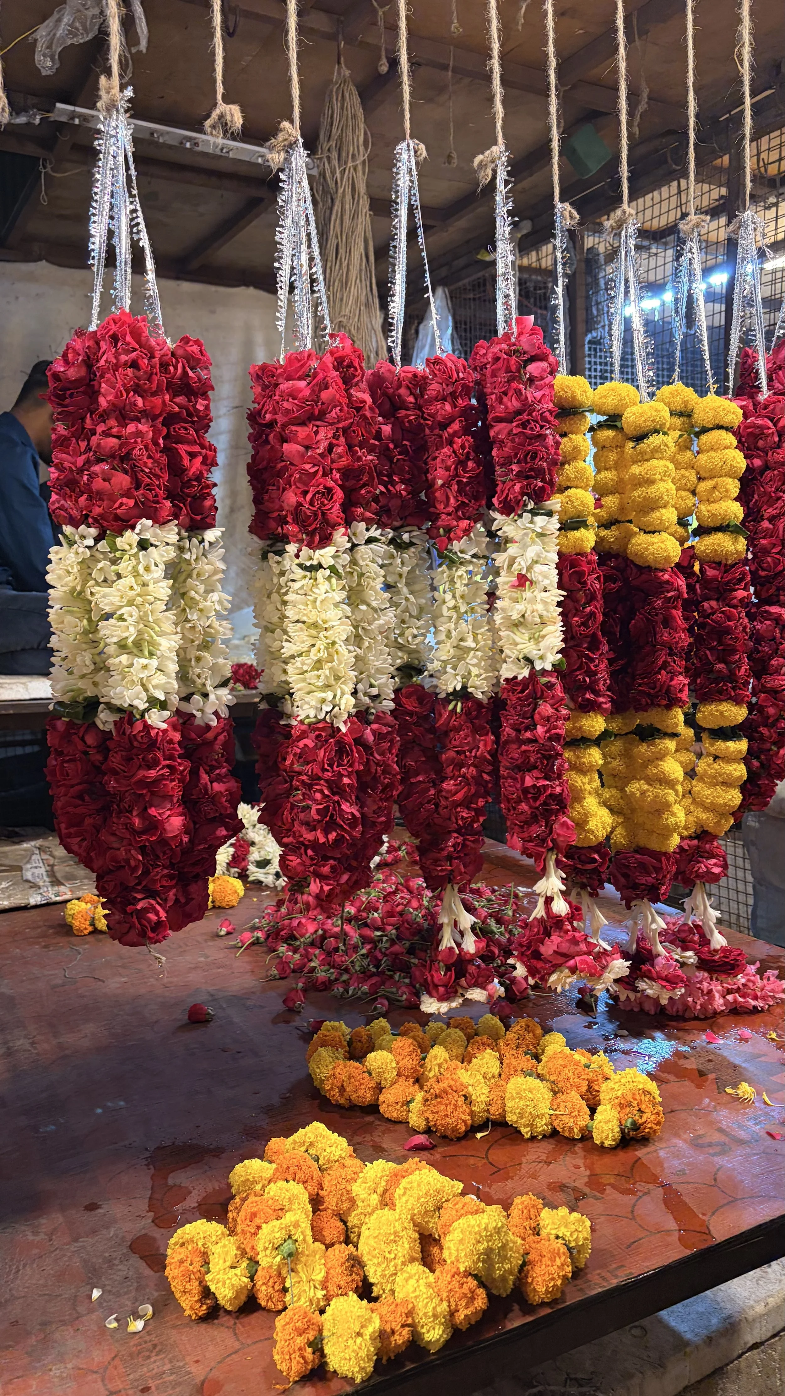 At any moment, something unexpected enters the scene. A cow might suddenly appear, pushing through the market. I watched one pull freshly stacked green twigs into its mouth, chewing steadily until it was hurried away. The atmosphere is hectic, intensely colorful, and largely male-dominated. It requires patience and a certain resilience to move through it, yet it remains strikingly picturesque. The flowers themselves are carefully arranged—rarely in vases, sometimes in buckets, but more often stacked or hung, like produce in a vegetable market. Sorted by type, yet forming an overall sense of dense, vibrant disorder.